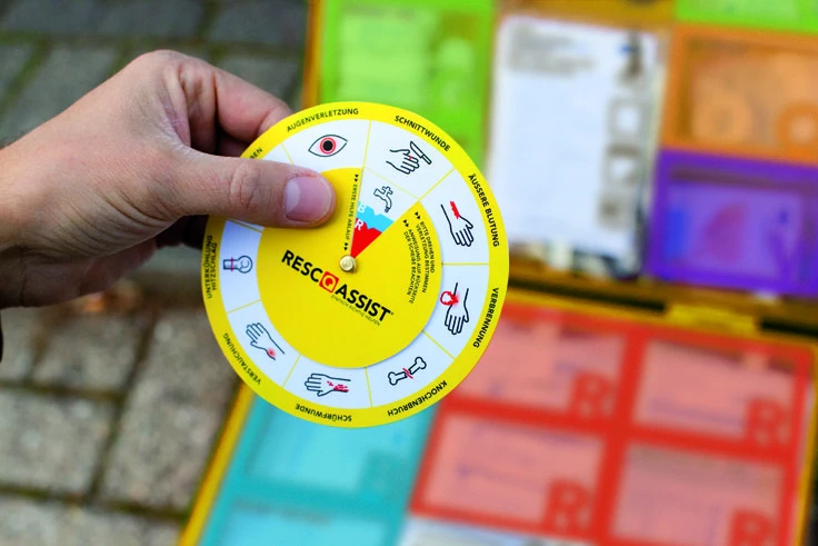 Der neue Verbandskasten RESQASSIST® besitzt eine innovative Notfallscheibe die als Diagnosehilfe kombiniert mit kurzen, verständlichen Handlungsanweisen ausgestattet ist. Zudem ist der Erste-Hilfe Koffer RESQASSIST® mit einem farblichen Wegweiser System ausgestattet, mit dem jeder Ersthelfer sofort zurechtkommt und vor allem: er verliert die Angst vor der eigenen Hilflosigkeit – er traut sich, selbst Hilfe zu leisten und Leben zu retten. Darüber hinaus sorgt die auffällige gelbe Signalfarbe vom Verbandskasten dafür, dass der RESQASSIST® einfach und schnell zu finden ist.