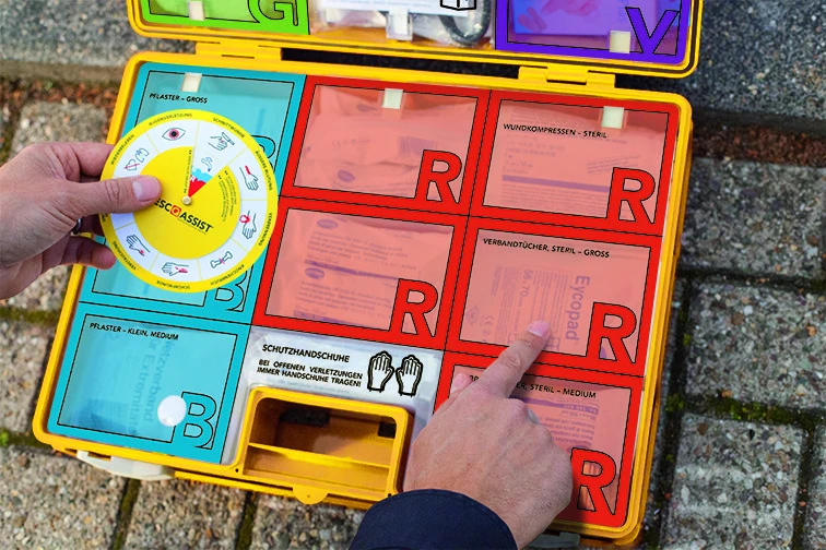sie leiten den Ersthelfer zu den richtigen Hilfsmitteln, die in entsprechende Fächer eingepackt sind. Diese Fächer sind zusätzlich mit Buchstaben beschriftet, damit auch Menschen mit Sehbehinderungen zuverlässig den korrekten Weg finden.