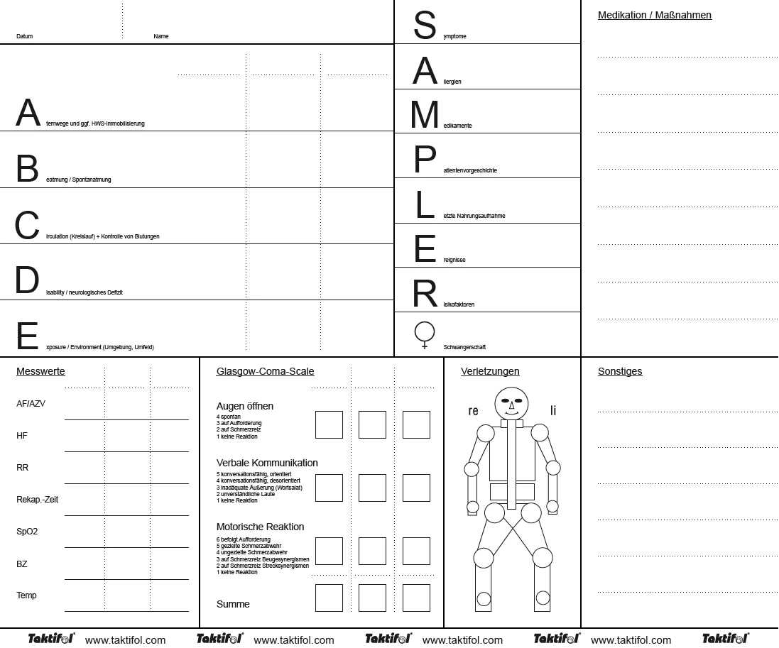 Die Folie ist bedruckt mit “ABCDE-Schema”, “SAMPLER”, “Glasgow-Coma-Scale” und anderen für die Patientenbeurteilung wichtigen Feldern. Die Felder für die Meßwerte sind dreispaltig – somit können Veränderungen in gewissem Rahmen festgehalten werden.